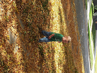 He is also in love with his plastic blue pumpkin and frequently takes Kyle's too. He fills them with toys and runs around with them. He loves pumpkins, remember his baby pumpkin from the store. He often gets it down from the table and over the month it has received quite a few bite marks all around it :)